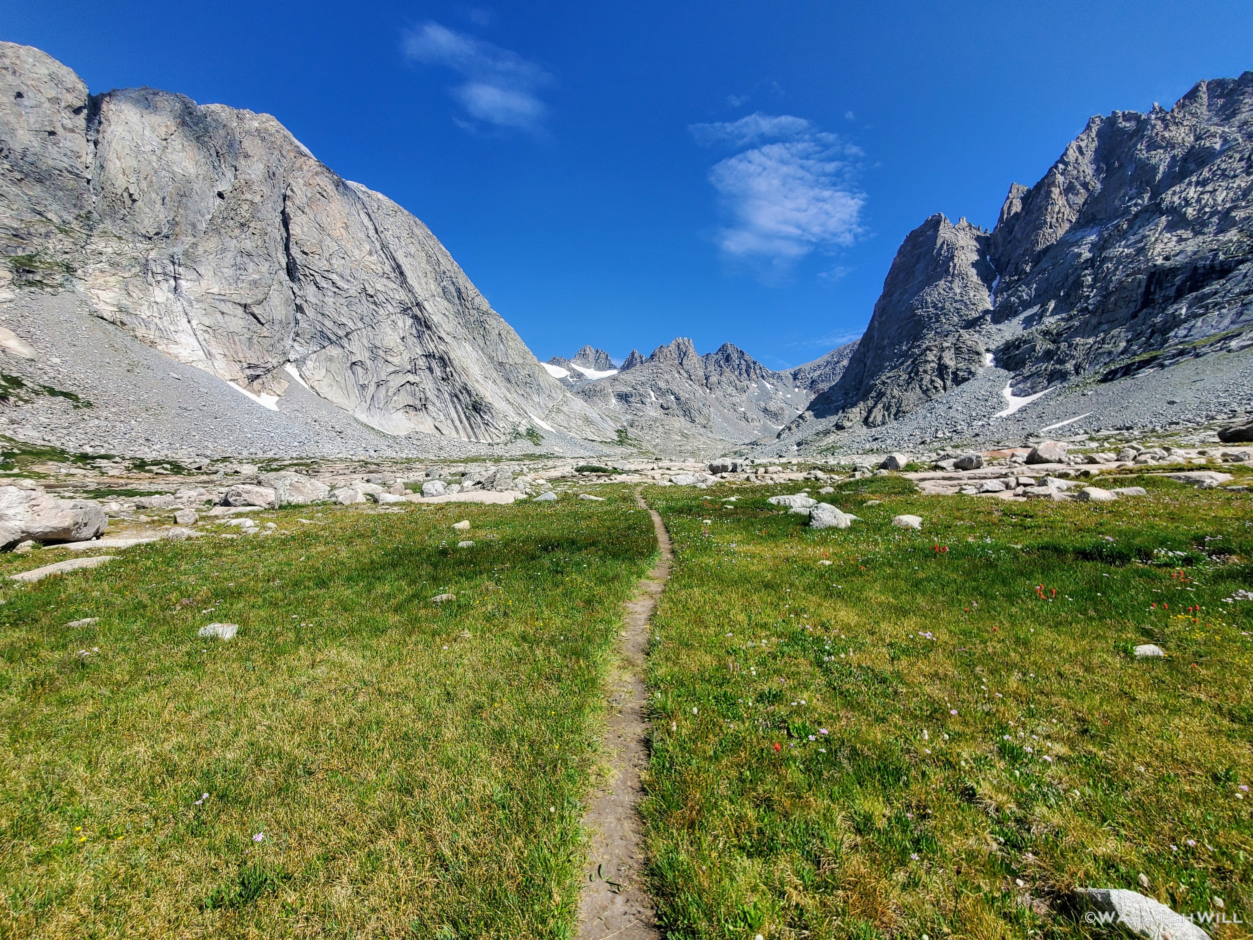 Trail in upper Titcomb with Bobs Towers straight ahead, Buttress at left, Helen at right